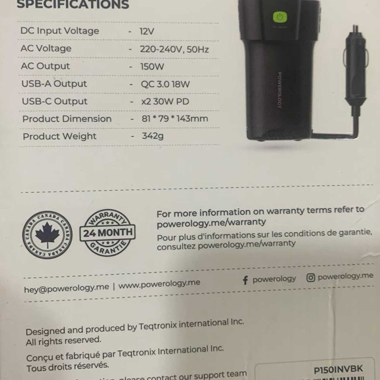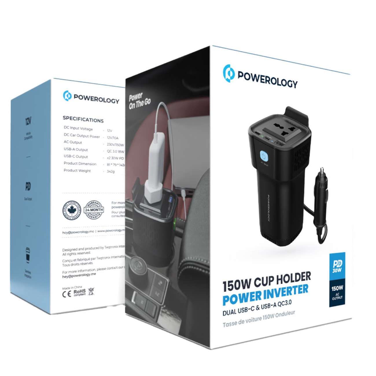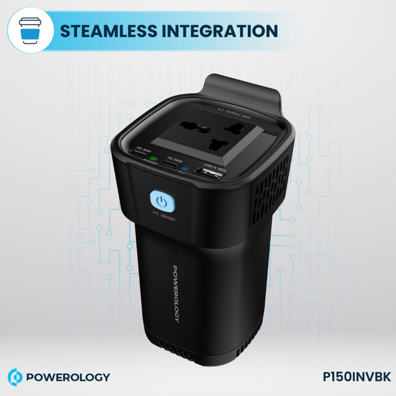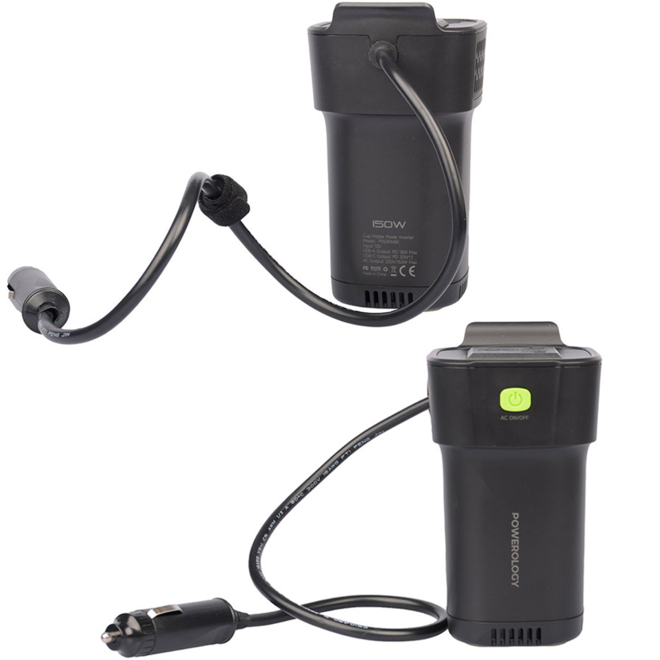Powerology P150INVBK 150W Inverter AC Universal USB A 2type-C DC Car 12V10A
