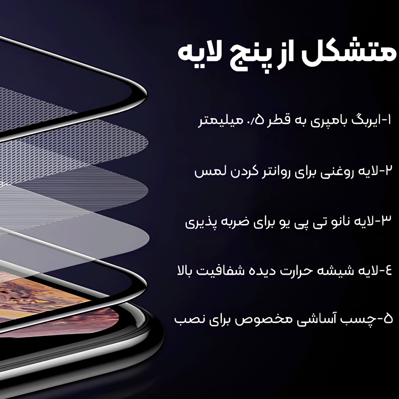 | سایر ویژگیها | - گلس ایربگ دار 5 بعدی - مقاوم در برابر شکستن و ترک خوردن - امکان استفاده از گوشی بدون قاب - آبگریز، ضدلک و اثر انگشت - پوشش کامل صفحه نمایش - شفافیت بالا HD - لمس بسیار روان و سریع - تمام چسب، نصب آسان |