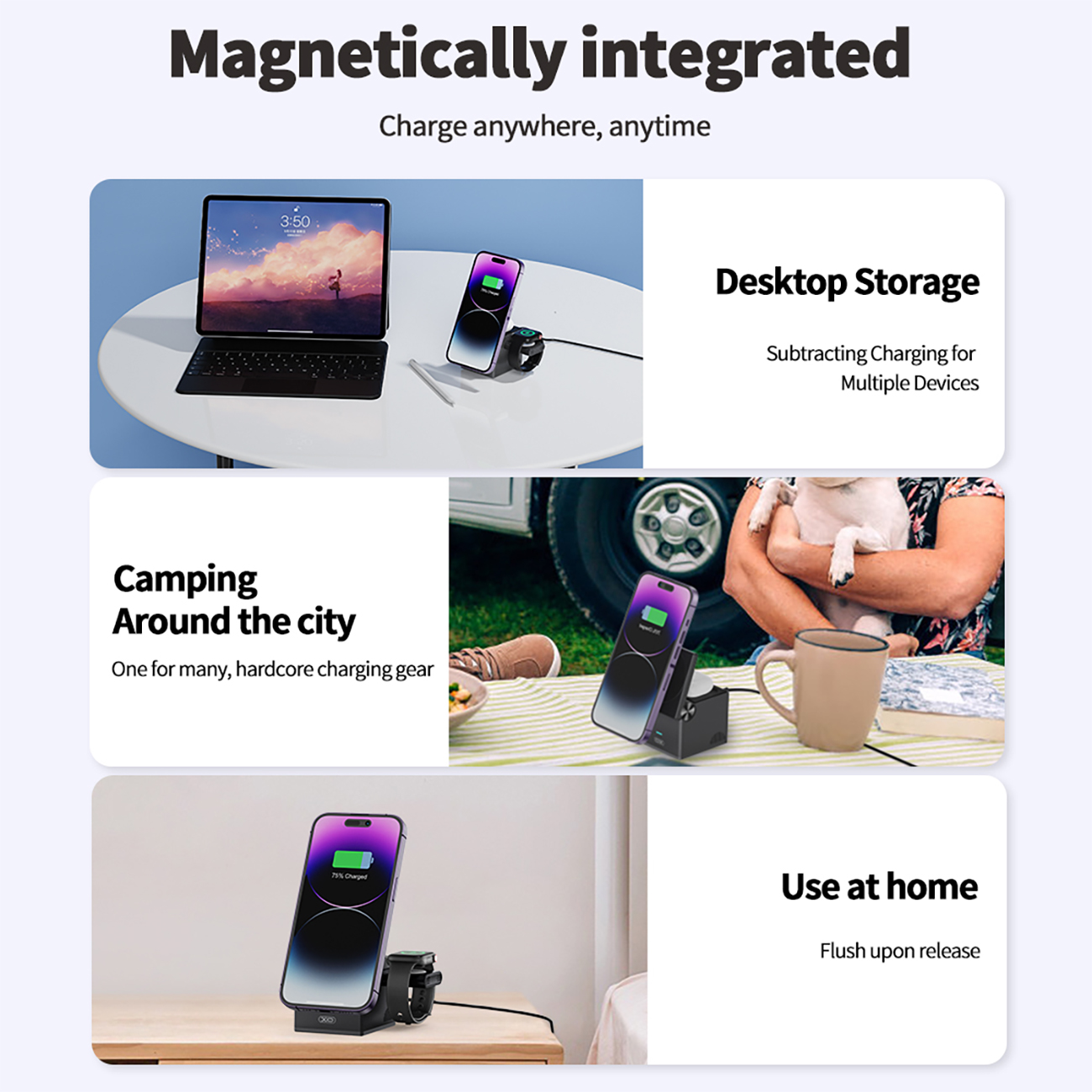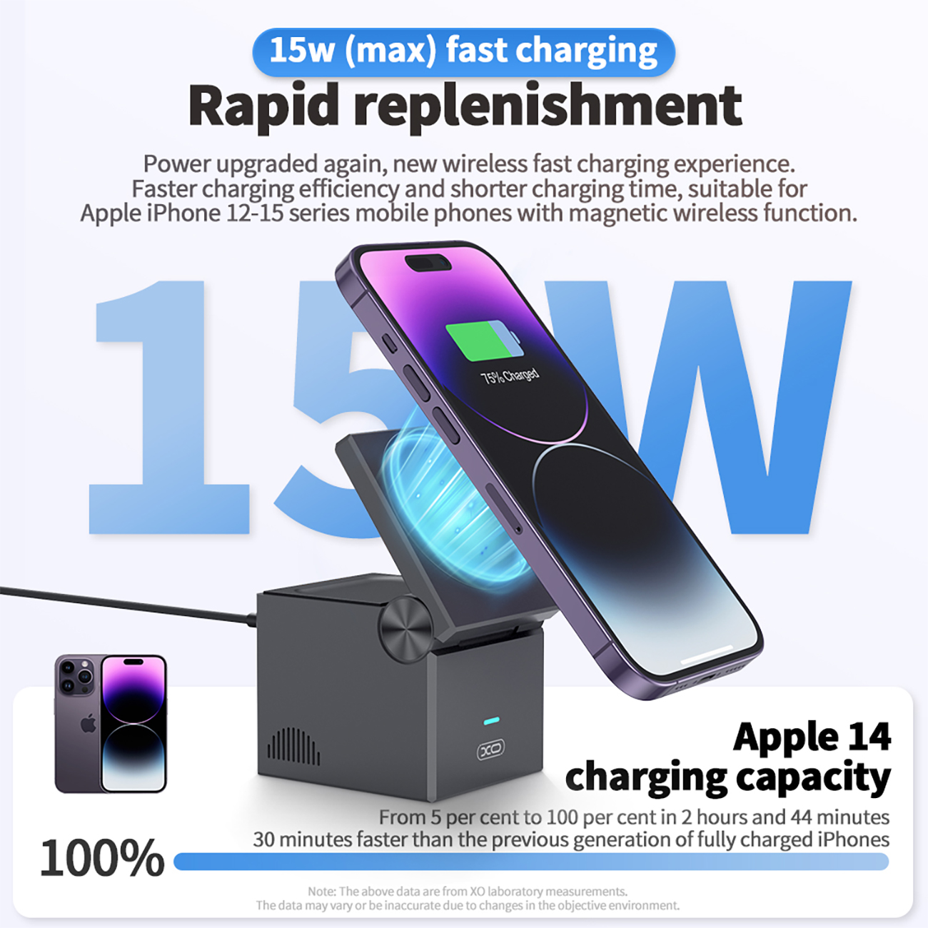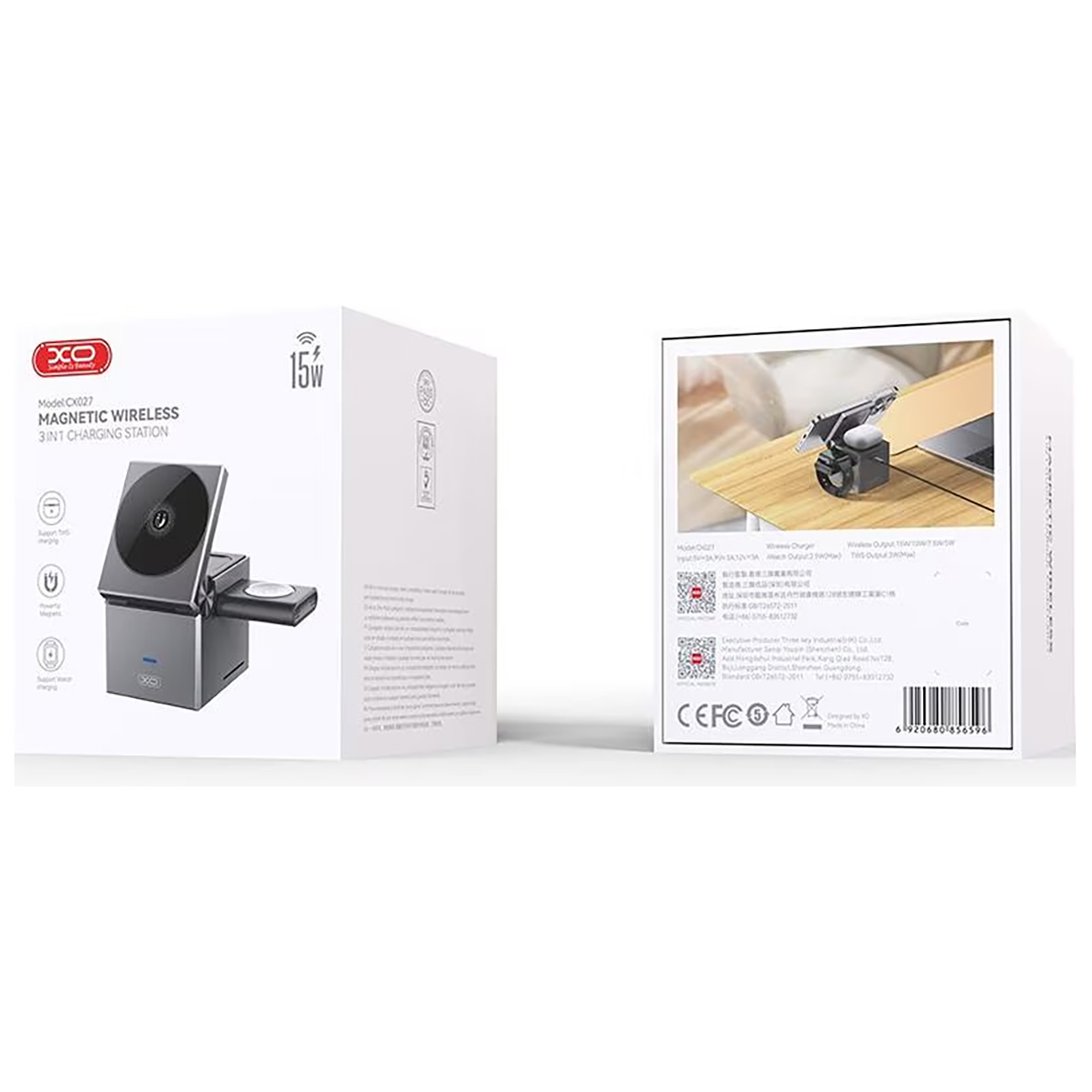 شارژر وایرلس رومیزی گوشی آیفون 12 تا 15 سه کاره 15 وات ایکس او CX027