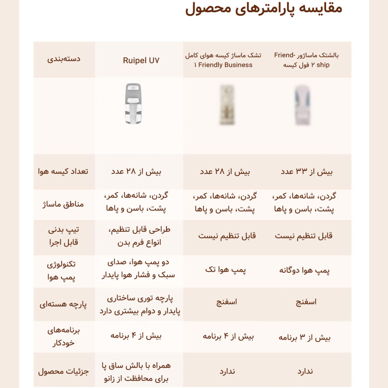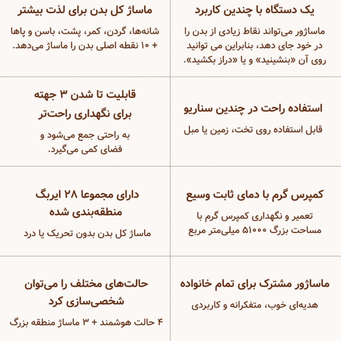 | قابل استفاده برای | تمام نقاط مختلف بدن، کمر، گردن، باسن، پاها، پشت، شانه و ... |