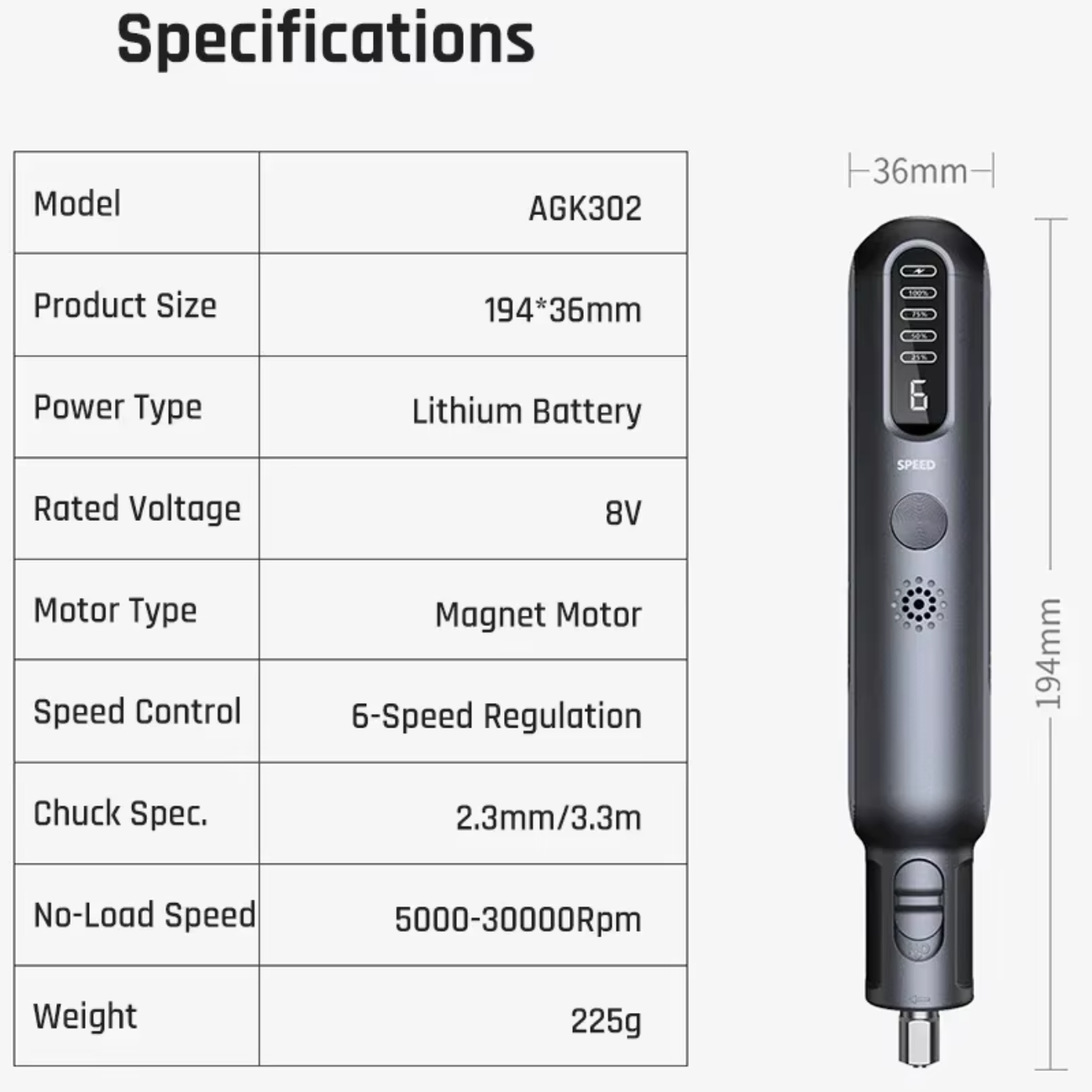 | کاربردها | حکاکی، پرداخت، زدودن زنگ، سنگزنی، تعمیرات ظریف و حرفهای |