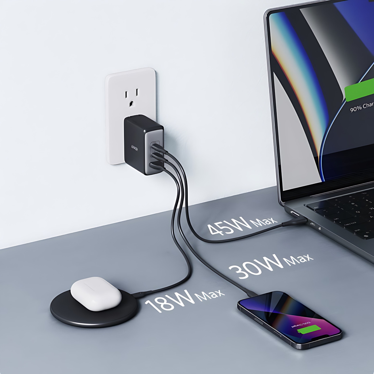 | ولتاژ خروجی | USB-C1: 5V = 3A, 9V = 3A, 15V = 3A, 20V = 5A USB-C2: 5V = 3A, 9V = 3A, 15V = 3A, 20V = 5A USB-A: 5V =3A, 9V = 2A, 10V = 2.25A, 12V = 1.5A |