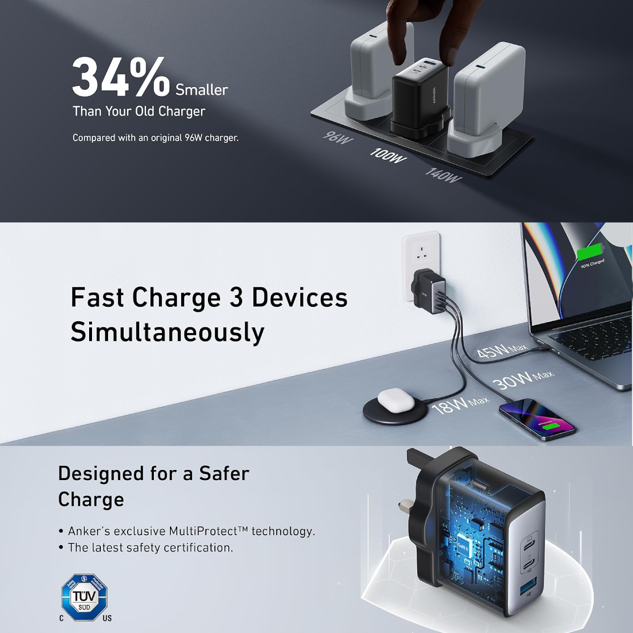 | سایر ویژگیها | - مجهز به فناوری Power IQ 3.0 - فناوری گالیوم نیترید GaN II - طراحی مینی، 34 درصد کوچکتر - شارژ سریع انواع لپتاپها و تبلتها - دارای دو پورت USB-C با توان 100 وات - دارای یک پورت USB-A با توان 22.5 وات |