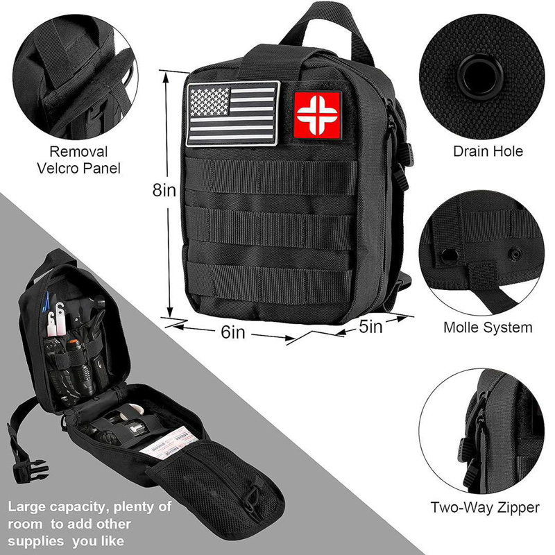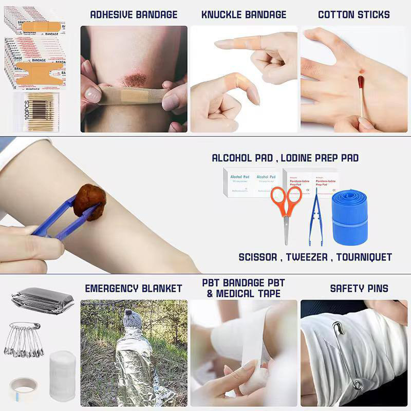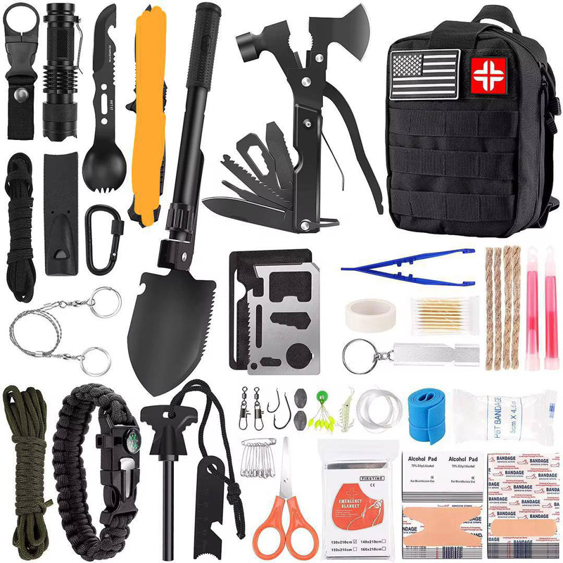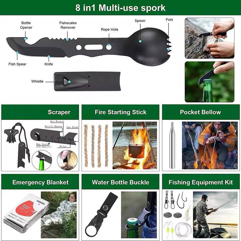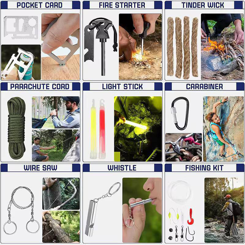 | تجهیزات کیف شامل | چاقو های متفاوت - انبر دستی - چکش فولادی - چراغ قوه - کیت کمک های اولیه کاورهای گرم کن - شعله زن - اتش زا سوت sos - 🆘 - طناب - اره دستی - چسب - کارت چند منظوره - دست بند قطب نما - سوت دو لوله - قلاب ماهیگیری بیل - قاشق - چنگال - قیچی - پد الکل - چراغ اصطراری دید در شب - بند اتصال به کیف - چسب زخم -تبر … |