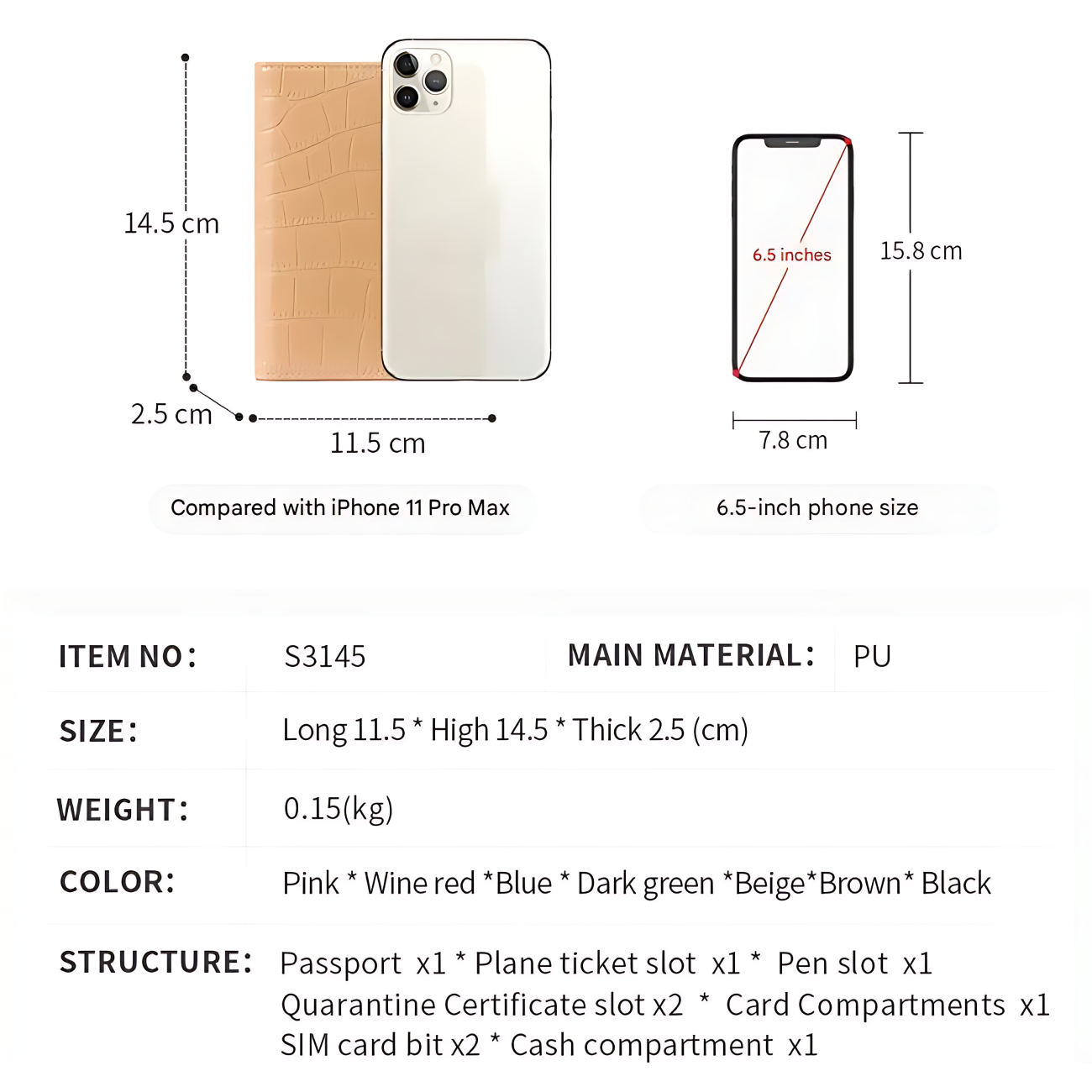 | تعداد محفظهها و ساختار داخلی | - جای پاسپورت ×1 - جای بلیط هواپیما ×1 - جای قلم ×1 - جای گواهی قرنطینه ×2 - جای کارت بانکی/شناسایی ×1 - جای سیمکارت ×2 - جای اسکناس ×1 |