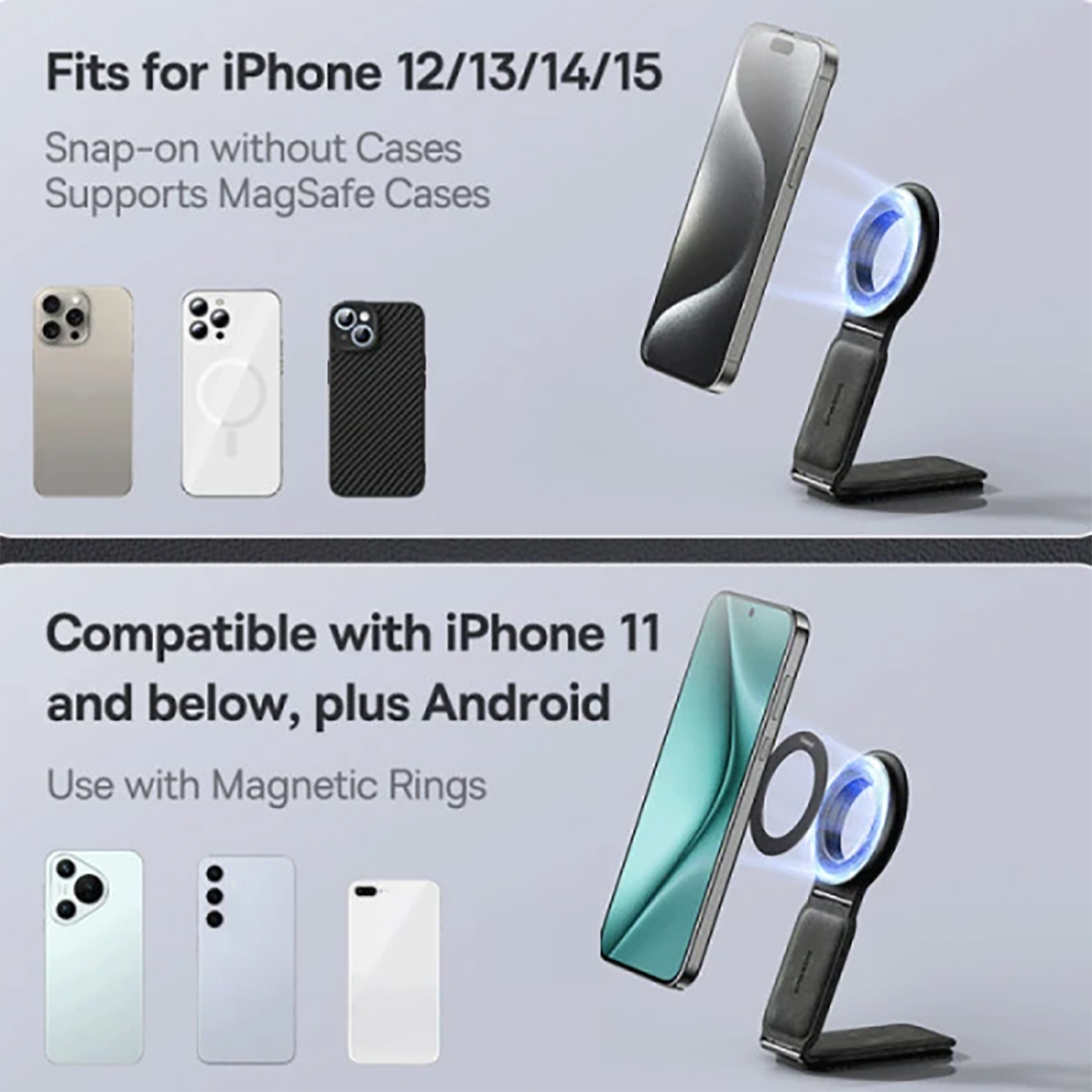 | مناسب برای | مناسب برای آیفون 12/13/14/15 بدون قاب و قابهایی که از MagSafe پشتیبانی می کند. سازگار با آیفون 11 و پایین تر به علاوه اندروید با استفاده از حلقههای مغناطیسی |