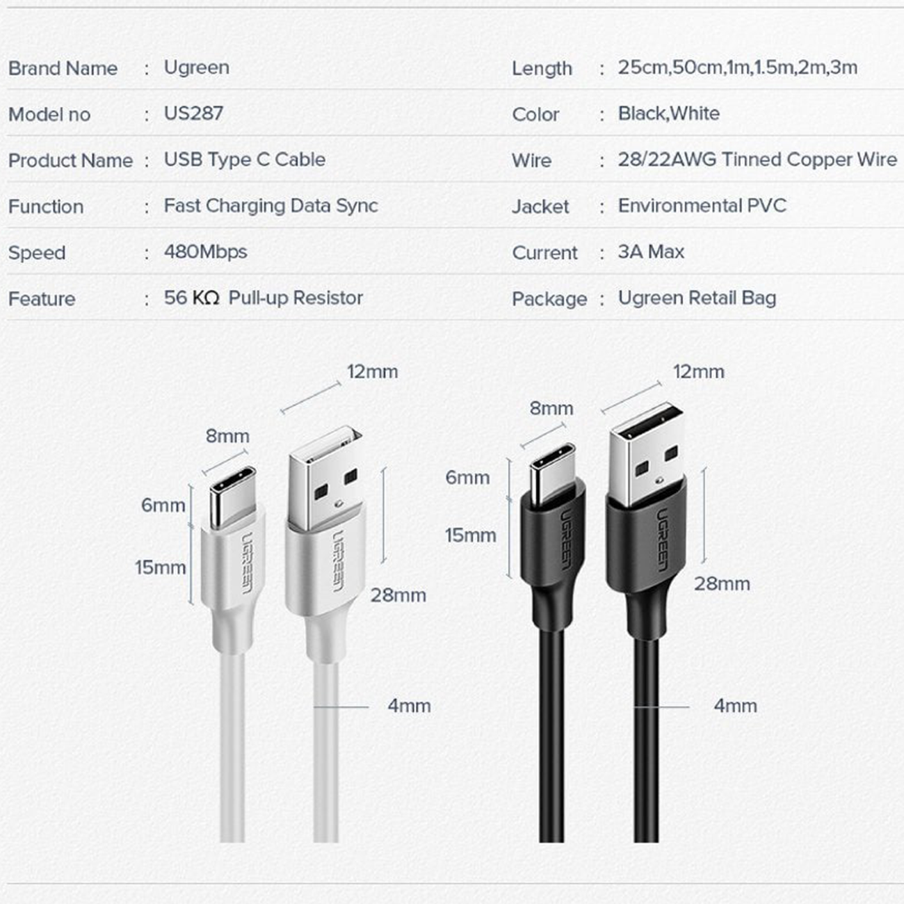 کابل USB به تایپسی 3 آمپر 2 متری یوگرین Ugreen US287 60118 شارژ سریع و انتقال داده