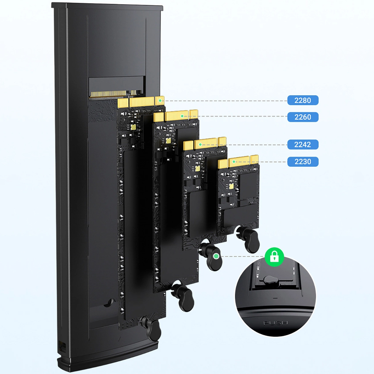 | سازگار با | SSDهای M.2 NVMe PCIe (کلید M و M+B Key)، اندازههای 2230, 2242, 2260, 2280 |