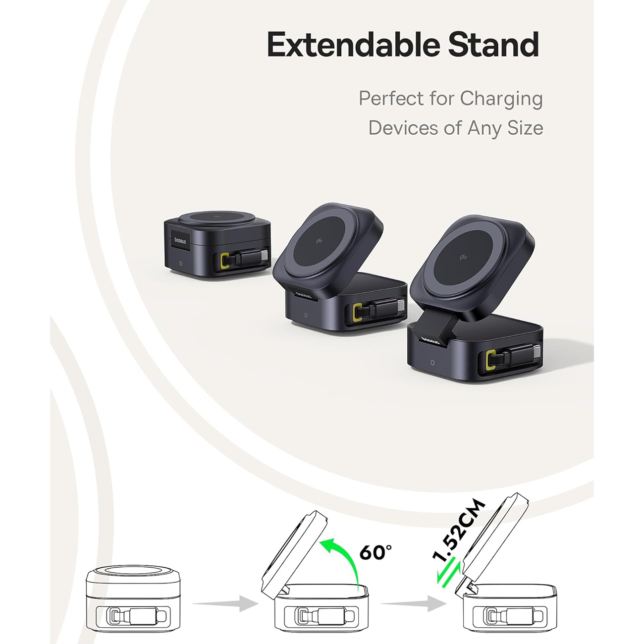 شارژر وایرلس 15 وات و هولدر موبایل مگنتی رومیزی بیسوس Baseus PicoGo BSW-540 با کابل تایپ سی جمع شونده 67 وات