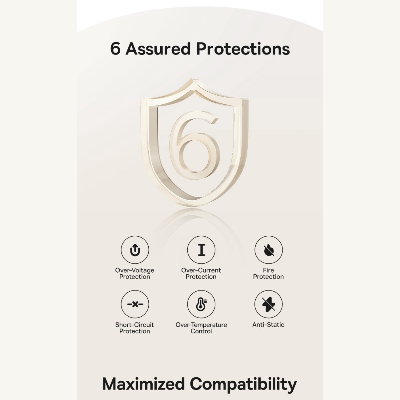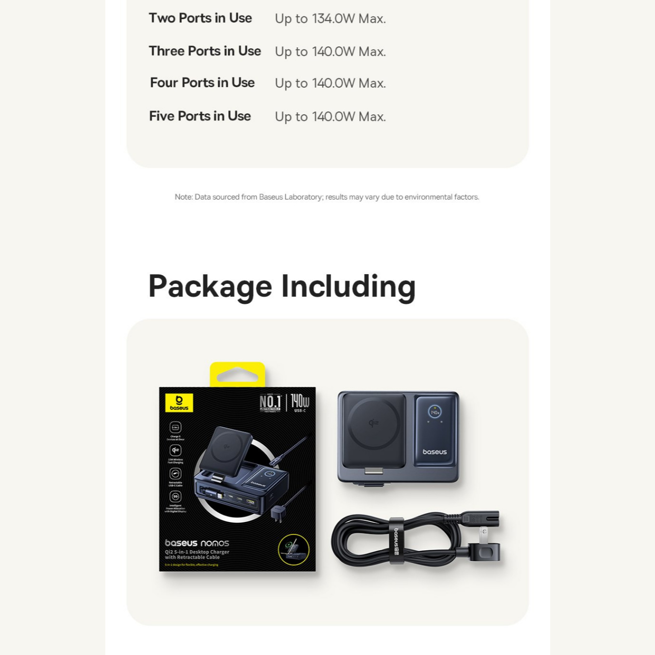 | سایر ویژگیها | توان کلی خروجی 140W با قابلیت تقسیم هوشمند بین پورتها پشتیبانی از فناوری PD 3.1, PD 3.0, QC 3.0, PPS و پروتکلهای شارژ سریع متداول شارژ وایرلس مغناطیسی استاندارد Qi2 با توان 15W برای آیفون (سری 12 تا 16، iOS 17.2+) توان وایرلس 5W برای برخی گوشیهای اندرویدی مجهز به Qi2 دارای 2 پورت USB-C با توان خروجی تکی هرکدام تا 100W مجهز به کابل USB-C جمعشونده (Retractable) با توان 100W 1 پورت USB-A با توان خروجی تا 15W نمایشگر دیجیتال LED/LCD برای نمایش توان لحظهای و وضعیت شارژ ورودی برق: AC 100-240V، 50/60Hz، 2.5A (max) کابل برق جداشونده با طول 1.5 متر جنس بدنه: پلاستیک مقاوم PC + ABS با تحمل حرارت و ضربه طراحی جمعوجور و رومیزی مناسب برای خانه، دفتر کار و سفر پایه شارژ وایرلس تاشو با قابلیت تنظیم زاویه و اتصال مغناطیسی قوی سازگار با لپتاپهای پرمصرف (MacBook Pro و سایر لپتاپهای USB-C) قابلیت شارژ همزمان چند دستگاه مختلف بدون افت سرعت محسوس تراشه هوشمند برای حفاظت در برابر اضافهولتاژ، اتصال کوتاه، افزایش دما و اضافهبار گواهی رسمی Qi2 (QI-ID 22121) برای شارژ بیسیم مطمئن تستهای ایمنی و گواهی FCC برای اطمینان از کیفیت و استاندارد جهانی طراحی مینیمال و زیبا برای مرتبسازی میز کار مناسب برای شارژ گوشی، تبلت، لپتاپ، هدفون و سایر گجتها محتوای جعبه: شارژر رومیزی، کابل برق 1.5m، دفترچه |