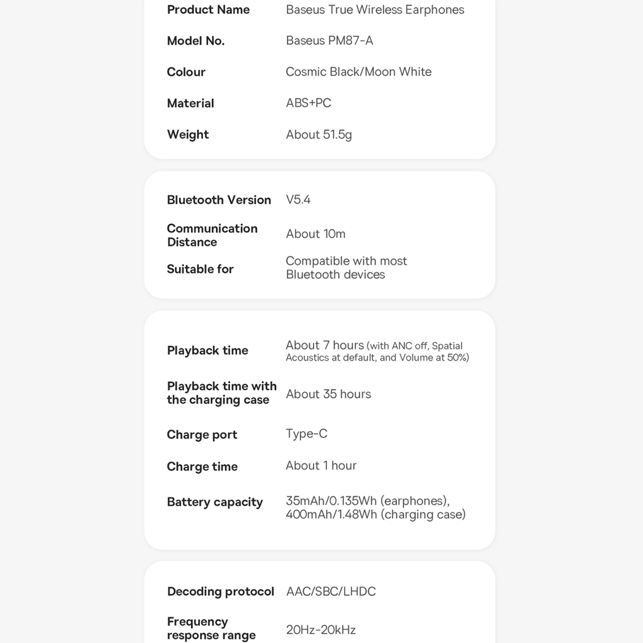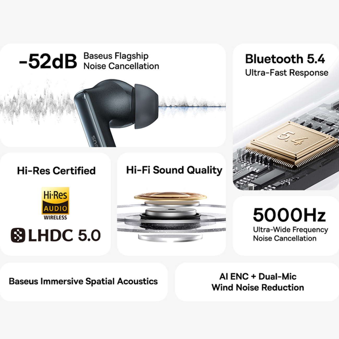 | سایر قابلیت ها | پروتکل 5.0، کیفیت بالا بیسیم، صدای فراگیر سهبعدی بیسئوس، شارژ سریع (10 دقیقه = 2 ساعت)، اتصال به دو دستگاه، کنترل لمسی، اپلیکیشن بیسئوس، پهنای باند حذف نویز 5000 هرتز، 10 سطح تنظیم حذف نویز فعال |