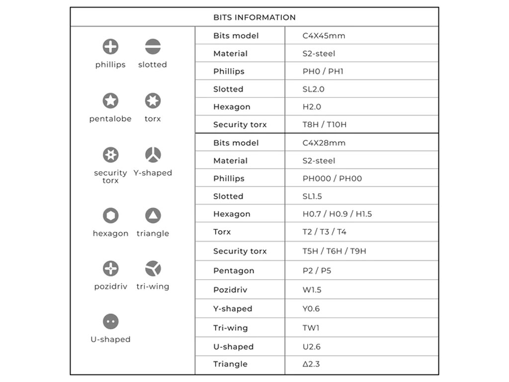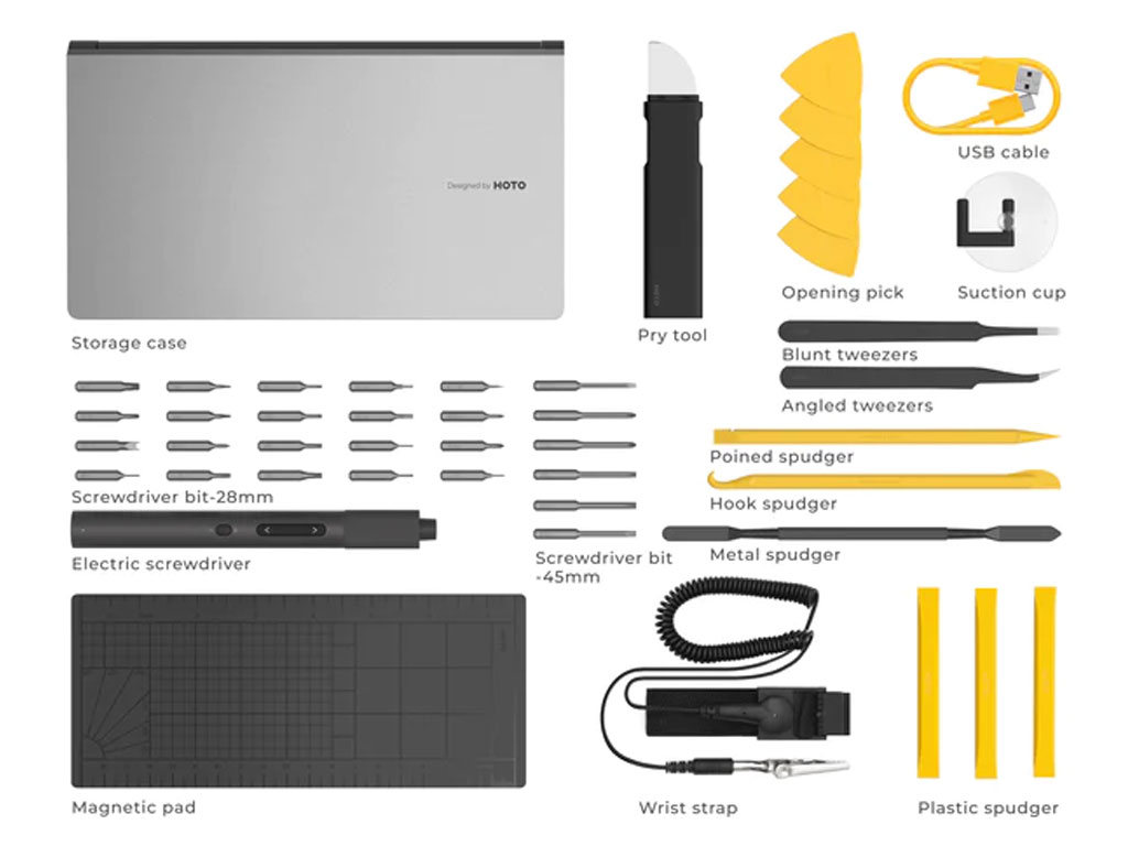 | محتویات | پیچ گوشتی شارژی ، پد مغناطیسی ، ۶عدد بیت ۴۵ میلیمتر ، ۲۰عدد بیت ۲۸ میلیمتر ، ۳ عدد ابزار تخریب پلاستیکی ، ۳ عدد ابزار تضعیف ،ابزار باز کردن دستگاه، مچبند ضد الکتریسیته ، ۲ عدد موچین ، مکنده ، کابل شارژ |