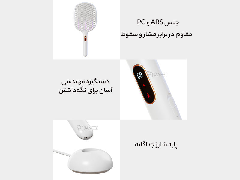 | لیست بسته بندی | پشه گیر برقی/ براکت دیواری/ شارژر پایه/ کابل داده نوع C |