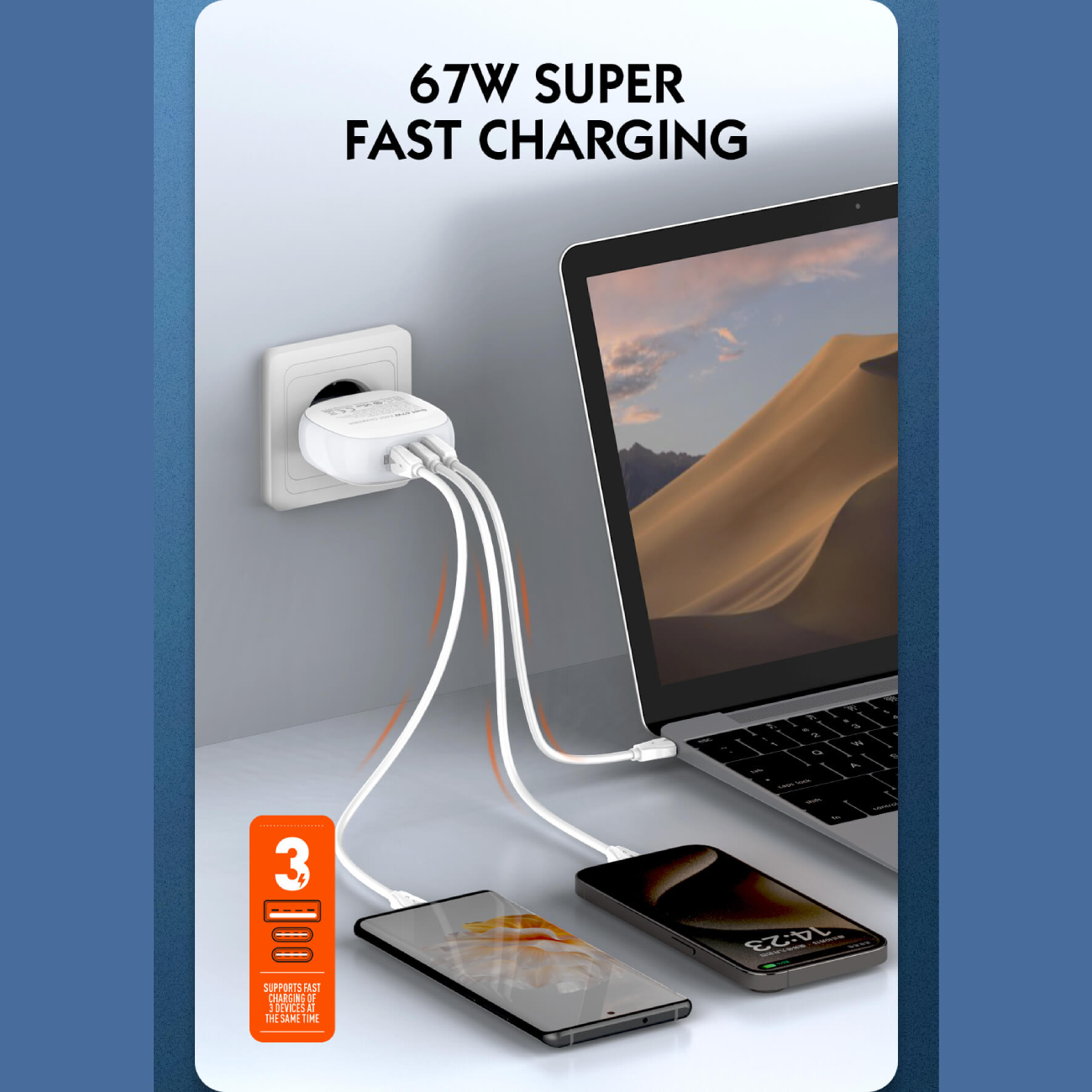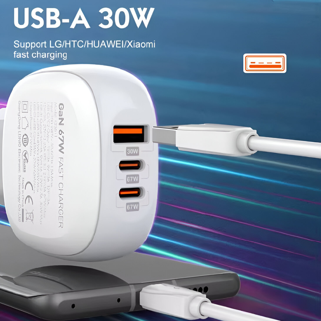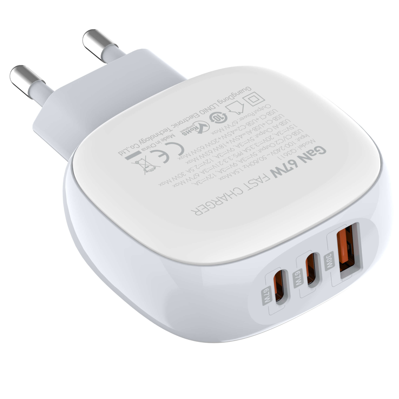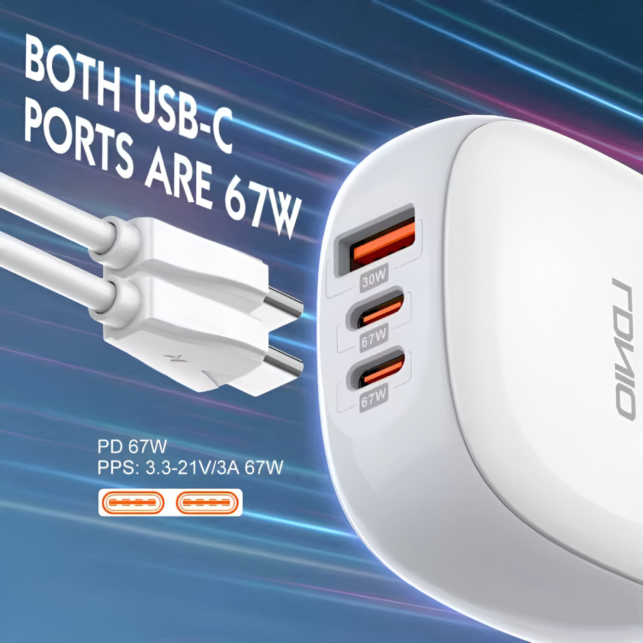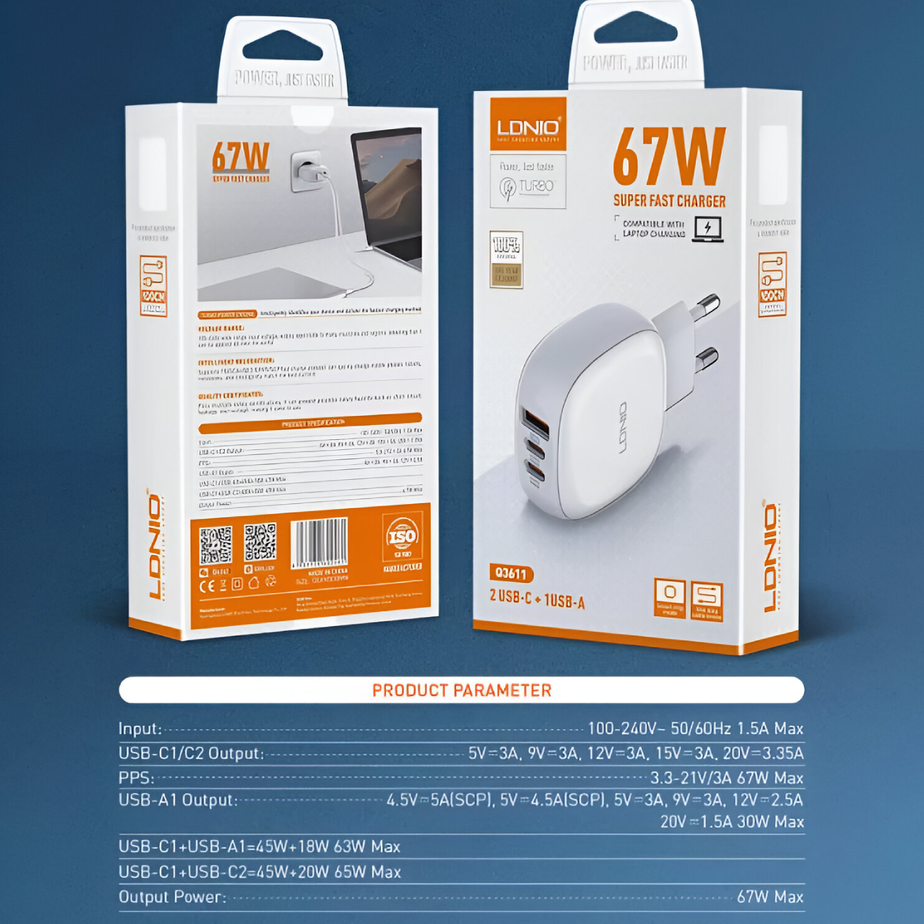 | ولتاژ خروجی | USB-C1/C2: 5V-3A,9V=3A,12V=3A,15V-3A,20V-3.35A, PPS 3.3-21V/3A 67W Max USB-A1: 4.5V-5A(SCP)5V-4.5AISCP),5V-3A 9V-3A,12V-2.5A20V-1.5A 30W Max |