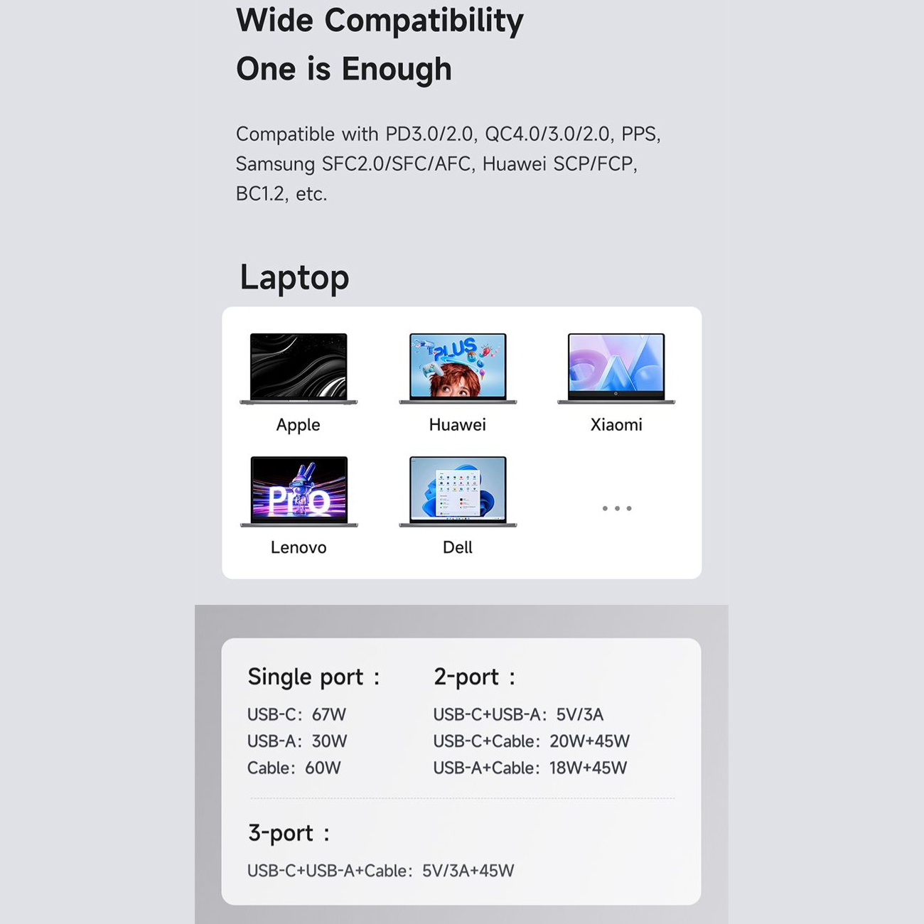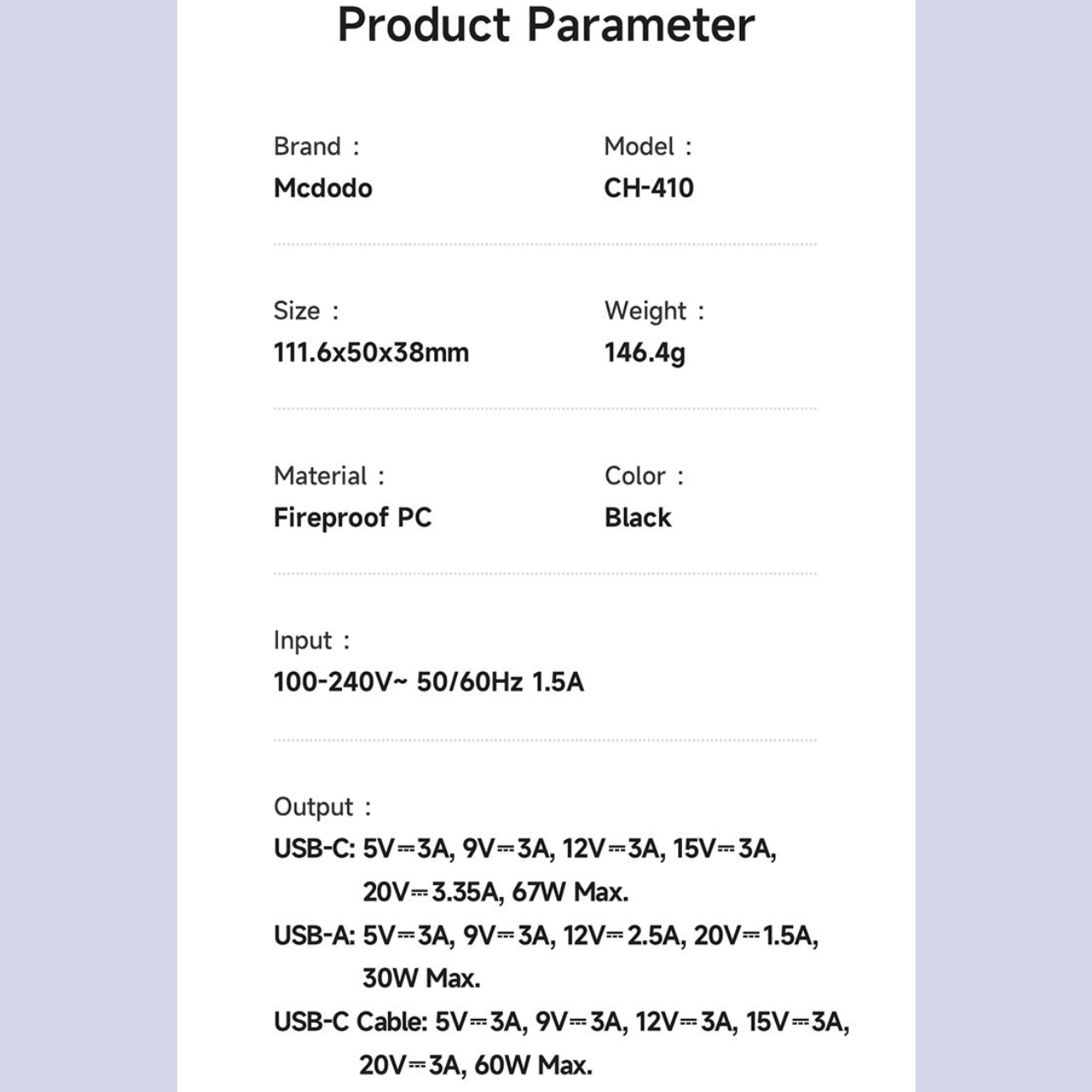 | ولتاژ خروجی | USB-C: 5V/3A, 9V/3A, 12V/3A, 15V/3A, 20V/3.35A 67W Max. USB-C Cable: 5V/3A, 9V/3A, 12V/3A, 15V/3A, 20V/3A 60W Max. USB-A: 5V/3A, 9V/3A, 12V/2.5A, 20V/1.5A 30W Max. |
